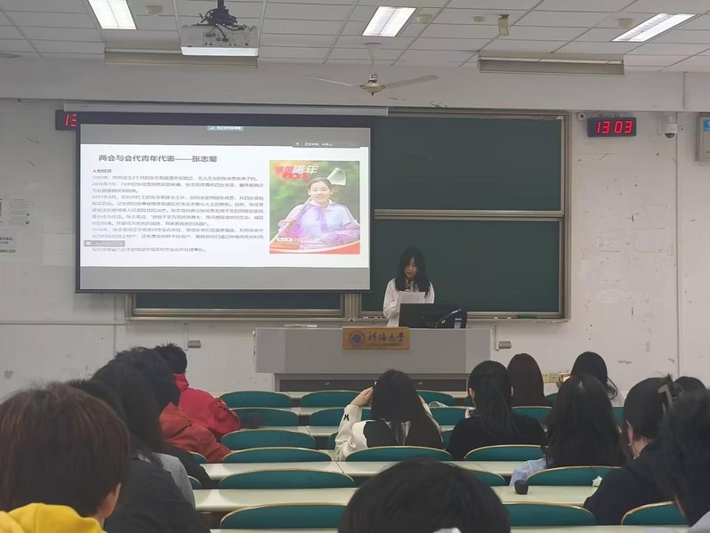 本次活动邀请到了学院青马公开课讲师杨欣同学、顾欣雨同学、李雨熙同学。公开课上,杨欣同学从政府工作报告内容、亮点等方带领同学们深入学习政府工作报告。顾欣雨同学从“十四五”规划的指导方针与远景目标、中国现代化建设的内容和要点、站在两会的关键节点、实现中华民族伟大复兴的中国梦这四个维度带领同学们了解2024年是中国现代化建设的关键之年,是一个承前启后、继往开来的关键之年。李雨熙同学重点介绍了全国两会的青年代表。全国两会上,有不少新当选的年轻面孔。不管是来自偏远山区、祖国边疆的青年代表,还是走遍世界、拥有丰富的国际交往经验的青年代表,都以自身的经历,向外界讲述着真实的中国故事。“强国建设、民族复兴的接力棒,历史地落在我们这一代人身上。”中国人有信心完成民族复兴伟业,中国青年更有信心担负起时代使命。