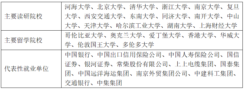 本专业培养的学生业务基础扎实,工作主动积极,具备负责和担当精神,对所从事工作岗位有很强的适应性。英语水平高,沟通、营销、商务策划能力强,深受用人单位欢迎。多年来平均就业率保持在98%以上,在保研、考研和出国留学等方面也展示出较强的综合竞争力,近五年继续升学率平均在40%以上,2023年继续升学率45%。一大批优秀学子纷纷进入北京大学、清华大学、浙江大学、南京大学、西安交通大学、东南大学、同济大学、美国哥伦比亚大学、英国爱丁堡大学等名校继续深造。