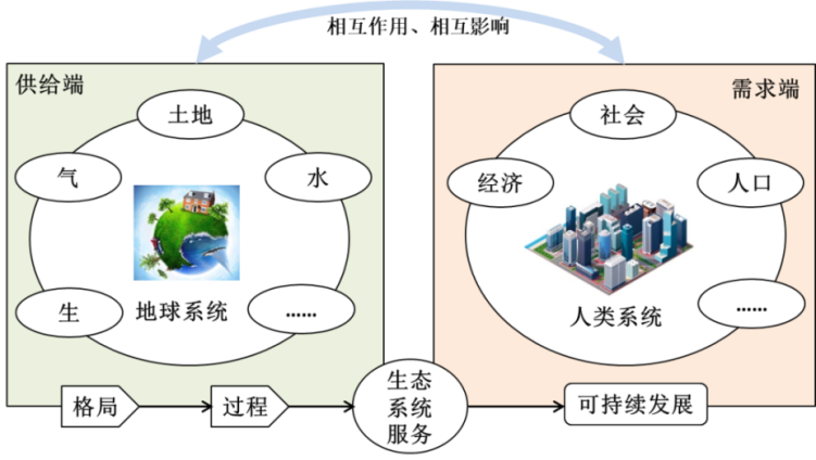 人地关系是指人类系统与地球系统之间的相互作用关系,即人类系统与地球系统之间以物质流、能量流和信息流为连接手段共同作用所形成的相互影响、相互制约的关联关系。人地关系理论是研究人类系统与承载人类活动的地球系统之间相互作用和互动关系的学科理论。本文基于人地关系理论构建了人地关系与生态系统服务的理论框架,如图1所示。其中,人地关系涉及到“人”和“地”两个方面,即一方面是以社会、经济和人口等为主要构成要素的人类系统,另一方面是以土地、水、气、生等为主要构成要素的地球系统。“地”对“人”的影响主要表现在地球系统为满足和支持人类生产生活需要而向人类系统提供各种生态产品和服务,即构成了“供给端”;“人”对“地”的影响主要表现在人类为满足自身发展需要而从地球系统中获取各种生态产品和服务,即形成了“需求端”。生态系统服务是指地球系统为人类系统提供的各种直接或间接惠益,即地球系统通过景观格局异质性和生态过程复杂性为人类系统提供了各种生态产品和服务,从而支持了人类生活和经济活动的发展需要,在一定程度上提升了人类福祉。人类系统以直接或间接的方式从地球系统获取各种生态系统服务以满足自身生产生活需要,人类系统的可持续发展受到地球系统的生态系统服务供给能力影响。