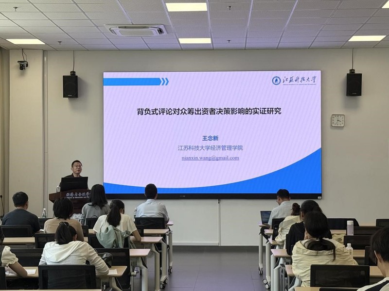 院长庞庆华主持活动。报告基于全球众筹市场爆发式增长背景,聚焦众筹项目发起人背负式评论行为对出资者决策的影响机制。研究突破传统分析框架,创新性地将发起人行为纳入研究体系,构建包含发起人角色、出资决策过程和背负式评论行为的理论模型,提出三类研究假设。通过面板Tobit模型实证分析发现:背负式评论对被评论项目众筹筹资绩效存在负向影响,发起人背负式评论行为可以减弱其负向影响,揭示评论抑制效应和注意分散效应的双重影响机制。研究采用内生性检验排除社交平台影响,通过更换因变量和估计模型进行鲁棒性检验,证实结论可靠性。该研究理论层面拓展了众筹研究边界,为平台评论区管理提供新视角,但在数据限制、遗漏变量和异质性等方面仍存在改进空间。互动环节中,参会师生就“背负式评论的互动性”与王教授展开深入探讨。庞庆华院长对本次讲座进行总结,并为王念新教授颁发讲座专家证书,感谢其对h视频