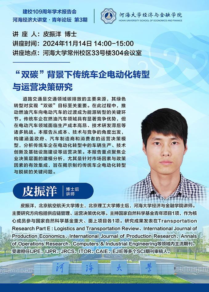 河海经济大讲堂·青年论坛 第3期:“双碳”背景下传统车企电动化转型与运营决策研究