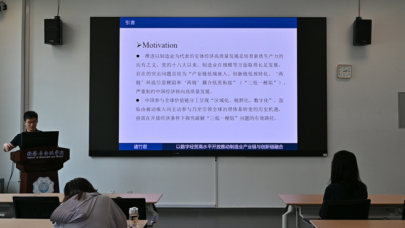 2013届国际经济与贸易专业校友、浙江工商大学经济学院副院长诸竹君教授受邀重返母校,在33号楼102学术报告厅作题为《以数字经贸高水平开放推动制造业产业链和创新链融合》的专题讲座。经济与金融学副院长李祎雯、学院青年教师、研究生参加了本次讲座,讲座由学院办公室主任左丽主持。讲座聚焦全球数字经贸规则变革背景下中国制造业的突围之路,为师生带来前沿理论与政策实践的深度解析。在讲座中,诸教授详细阐述了数字经贸开放促进“双链”融合的理论机制。在效率增进方面,创新主体能够借助大数据平台、工业互联网等载体,搭建创新供给端与需求端的互动平台,推动制造业创新模式转变;在要素优化方面,网络联通机制推动数据要素的安全跨区转移,打破产业链各环节的信息壁垒,实现创新资源的优化配置;在质量升级方面,数字产品产业驱动机制培育智能制造系统集成服务商,促进企业探索个性化定制、远程运维服务、网络协同制造等新模式,形成对制造业工艺升级的反向拉动作用;在动力转型方面,数字驱动型创新精准链接机制依托人工智能匹配技术,实现创新资源与产业需求的精准对接,大幅降低创新资源错配。这四大机制共同构成了推动“两链”